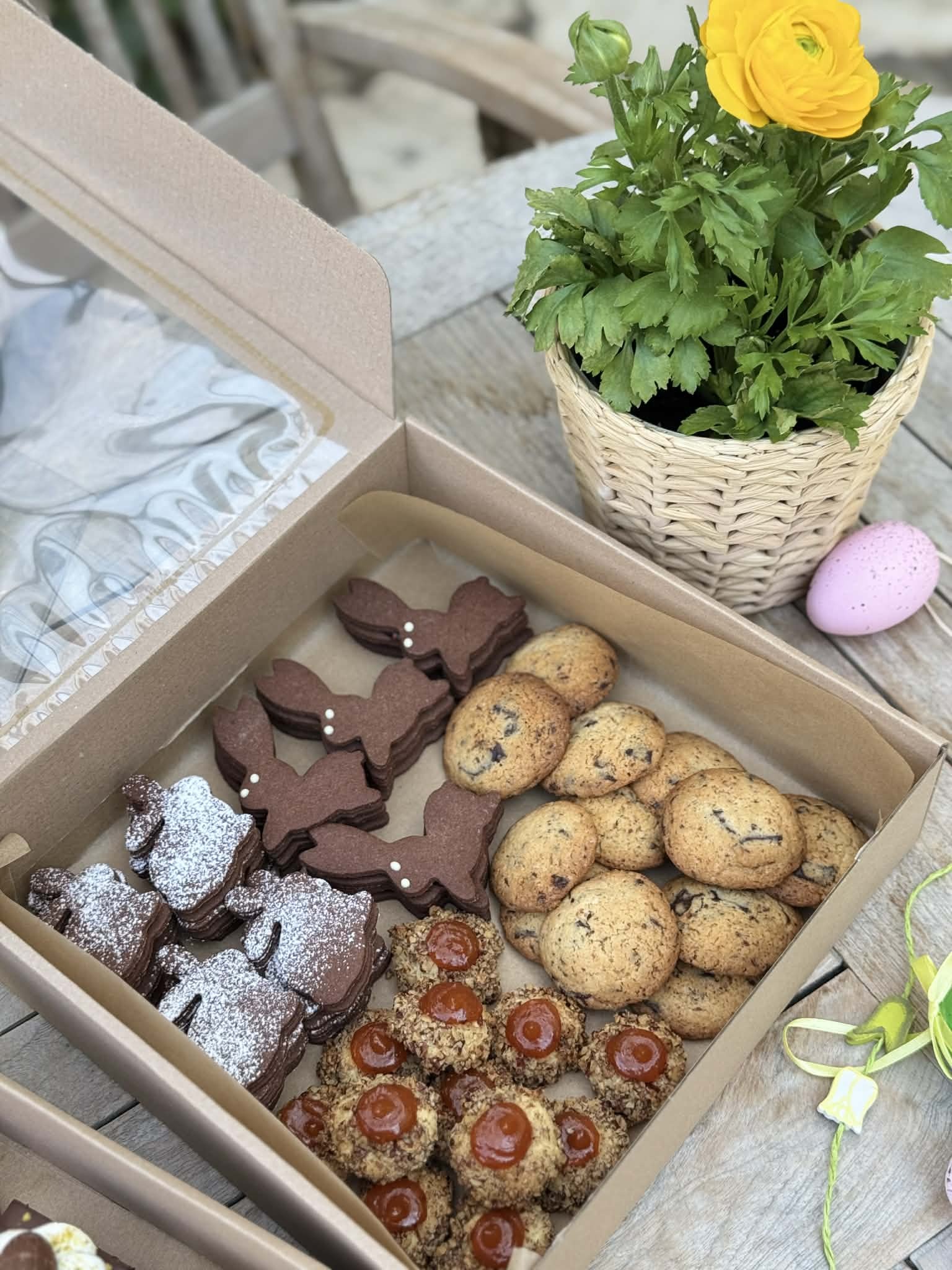 Boxy obsahujú kakové linecké pre šibačov, chrumkavé domáce čokoládové keksíky a drobné koláčiky s marhuľovým džemom a pekanový orechami.