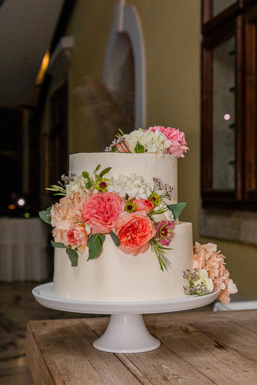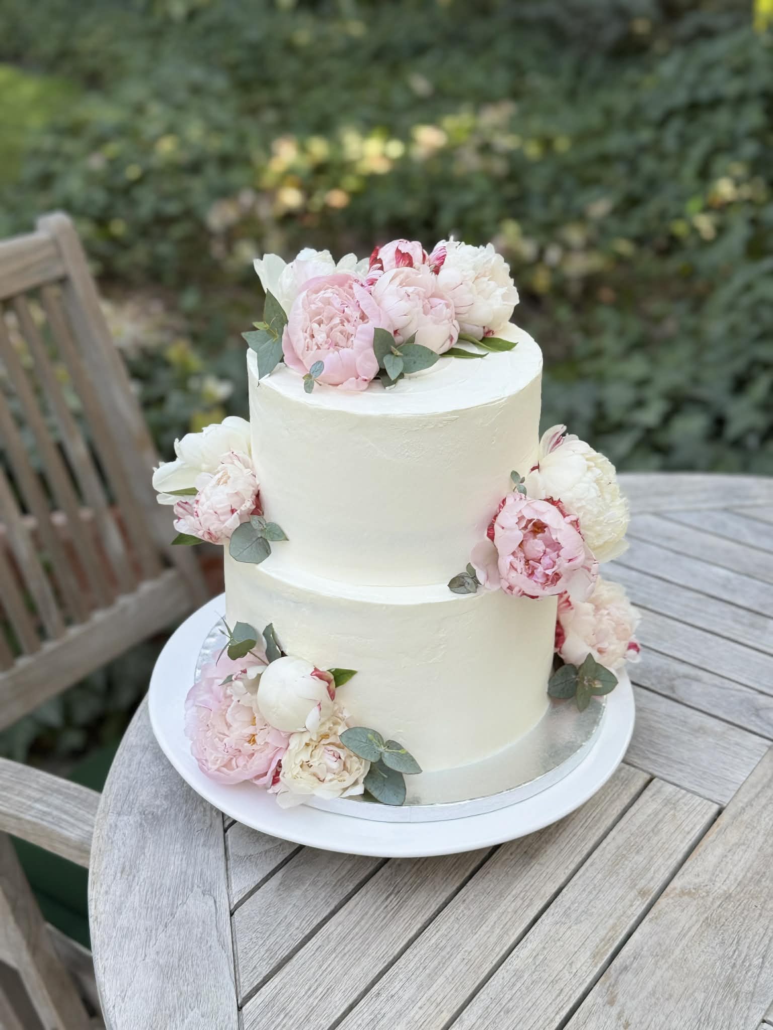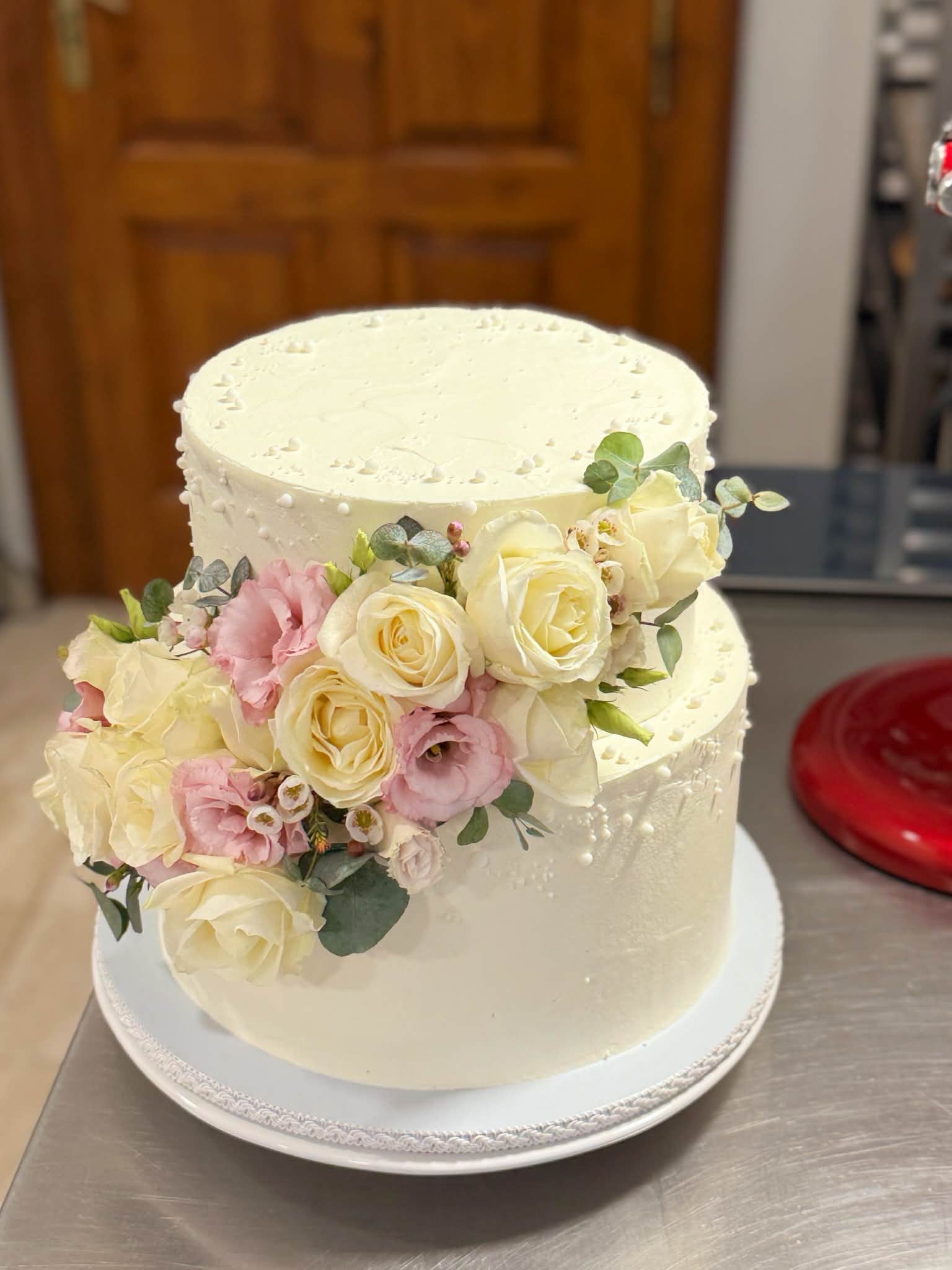Dvojposchodové svadobné torty s hmotnosťou približne 5 kg pripravujeme v rôznych dizajnoch podľa želania klientov. Štandardne ich dekorujeme živými kvetmi, ktoré ladia so svadobnou kyticou alebo s kvetinovou výzdobou svadby.